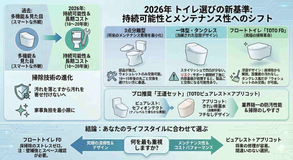2026年現在、住宅設備のトレンドは「多機能」から「持続可能性とメンテナンス性」へと明確にシフトしています。かつては見た目のスマートさだけで選ばれていたトイレも、今では「10年後、20年後にいくらコストがかかるか」という視点が欠かせません。
