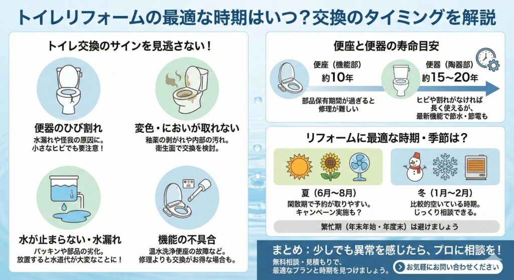 本記事では、トイレリフォームの最適な時期や交換のサイン、最新トイレへ交換するメリットについて解説してきました。