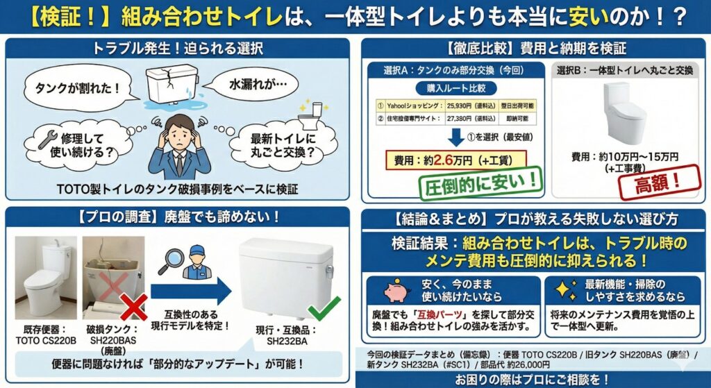 今回は、私たちが実際に体験した「TOTO製トイレのタンク破損」の事例をベースに、プロがどのように考え、どちらが本当にお得なのかを検証した結果を詳しく解説します。