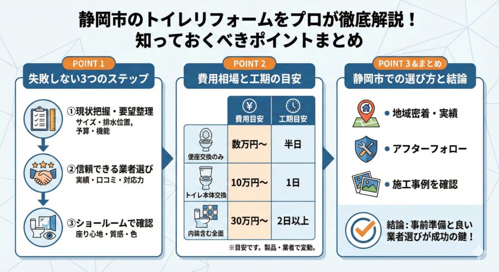 本記事では、静岡市でトイレリフォームを検討する際に知っておきたいメリットや費用相場、業者選びのポイントについて詳しく解説してきました。