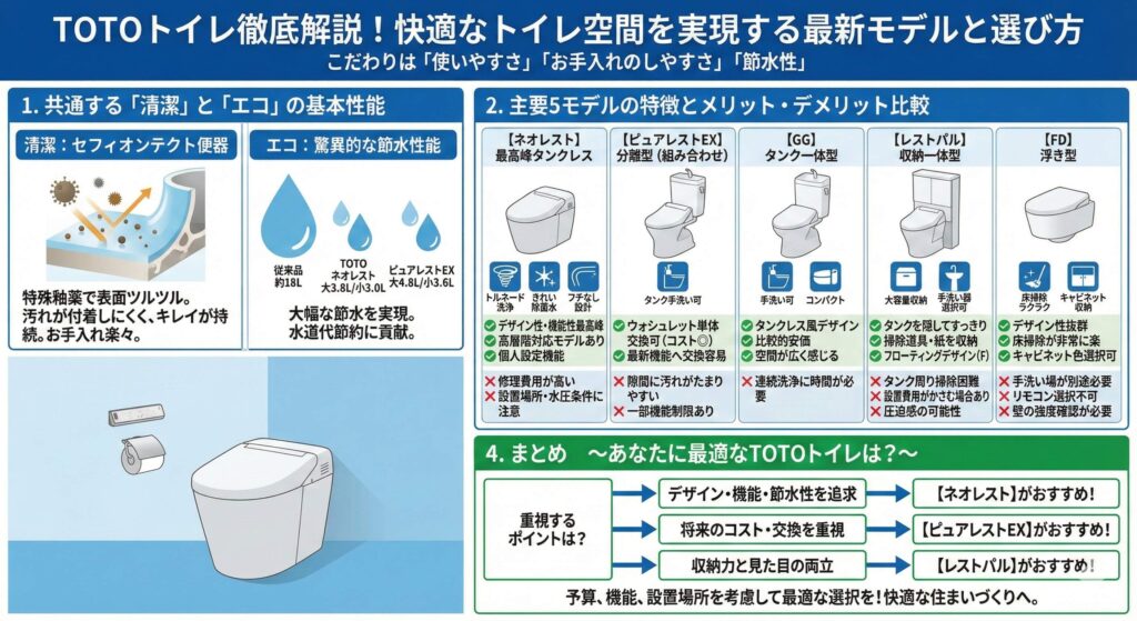 ご自身の予算、重視する機能(デザイン・清掃性・ランニングコスト)、そして設置する場所(高層階の有無)を考慮して、最適なTOTOトイレを選ぶことが快適な住まいづくりに繋がります。