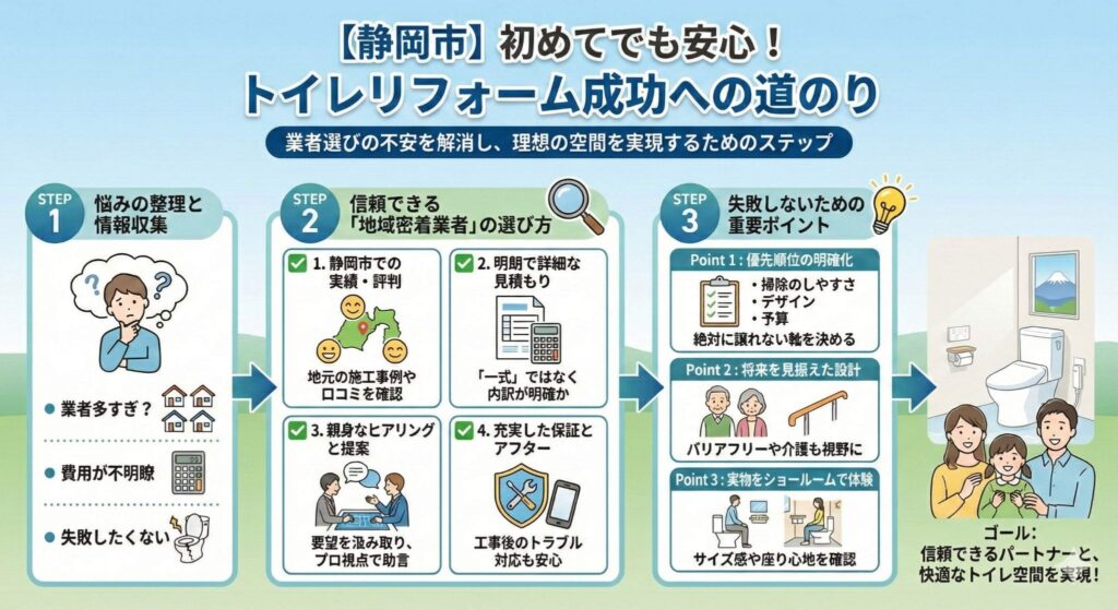 ぜひ、ご家庭のライフスタイルや優先順位に合った最適な業者を選び、清潔で快適なトイレ空間を手に入れてください。納得のいくリフォームが実現することを願っています。