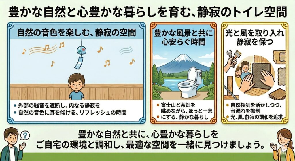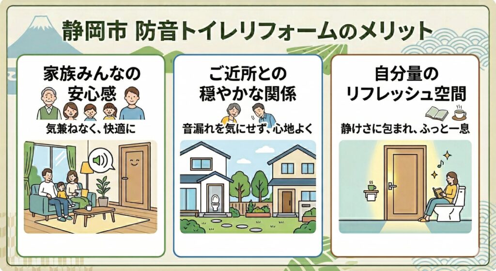 この章では、静岡市の住まいや文化に寄り添いながら、防音トイレリフォームが届けてくれる3つのメリットをご紹介します。
