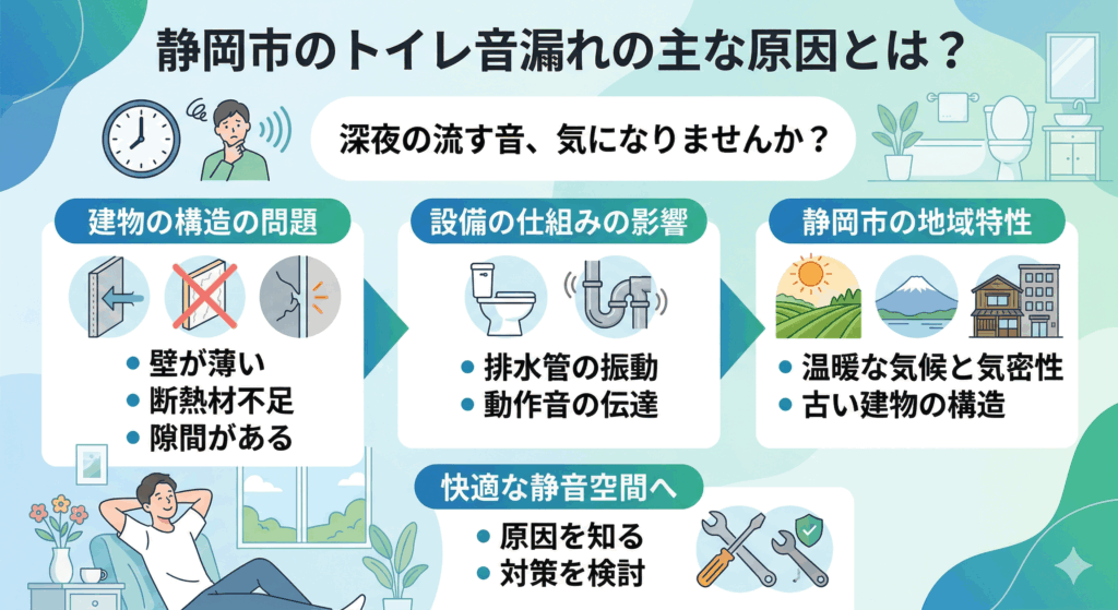 「深夜にトイレを流すとき、音が気になって少し躊躇してしまう」という経験はありませんか?実は、トイレの音が部屋に伝わる背景には、建物の構造や設備の仕組みといった、住まいならではの理由があります。静岡市の気候や住宅事情も交えながら、音漏れの原因をわかりやすく紐解いていきます。原因を知ることが、快適で静かなトイレ空間への第一歩です。