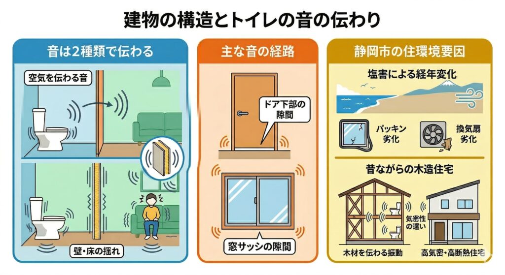 トイレの音がリビングや廊下に伝わってしまう主な原因は、「建物の構造」にあります。音は壁の厚みや、ドア・窓のわずかな隙間を通じて広がる性質を持っています。静岡市の住環境では、地域特有の気候や住宅事情が音の伝わり方に影響するケースもあり、まずはその仕組みを理解しておくと安心です。