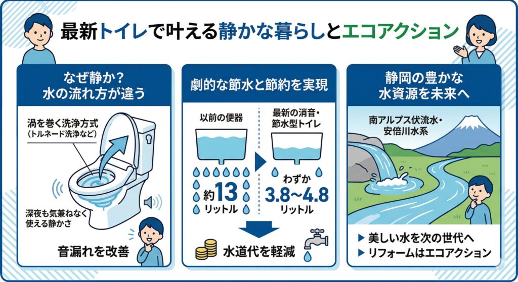 静岡市は、南アルプスに育まれた豊かな伏流水や清らかな安倍川水系の恩恵を受け、全国でも水がおいしい都市として知られています。その美しい水資源を次の世代へ引き継いでいくためにも、日々の暮らしの中での水の使い方を見直すことが大切です。ご自宅のトイレを節水・消音型の最新モデルへリフォームすることは、ご家族の快適な暮らしを守りながら、静岡市の豊かな自然環境を大切にするエコアクションにもつながります。