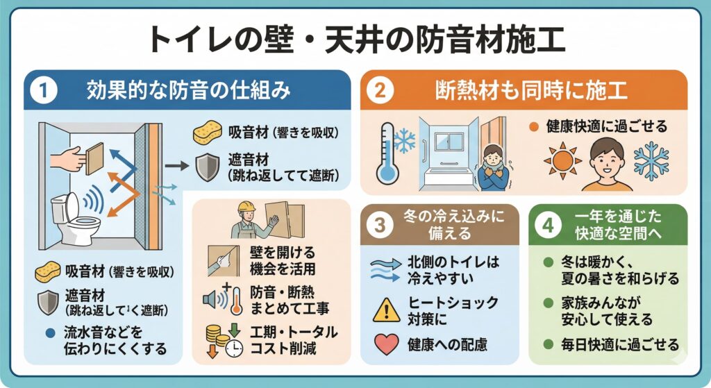 トイレ全体の音環境をしっかり整えたい方には、壁や天井への防音材施工がとても効果的です。さらに、壁を開けるタイミングに断熱材も一緒に施工することで、防音と快適な温度環境を同時に手に入れることができます。温暖な静岡市でも、冬場のトイレの冷え込みが気になる方にとっても、心強い選択肢です。仕組みとメリットをわかりやすくご説明します。