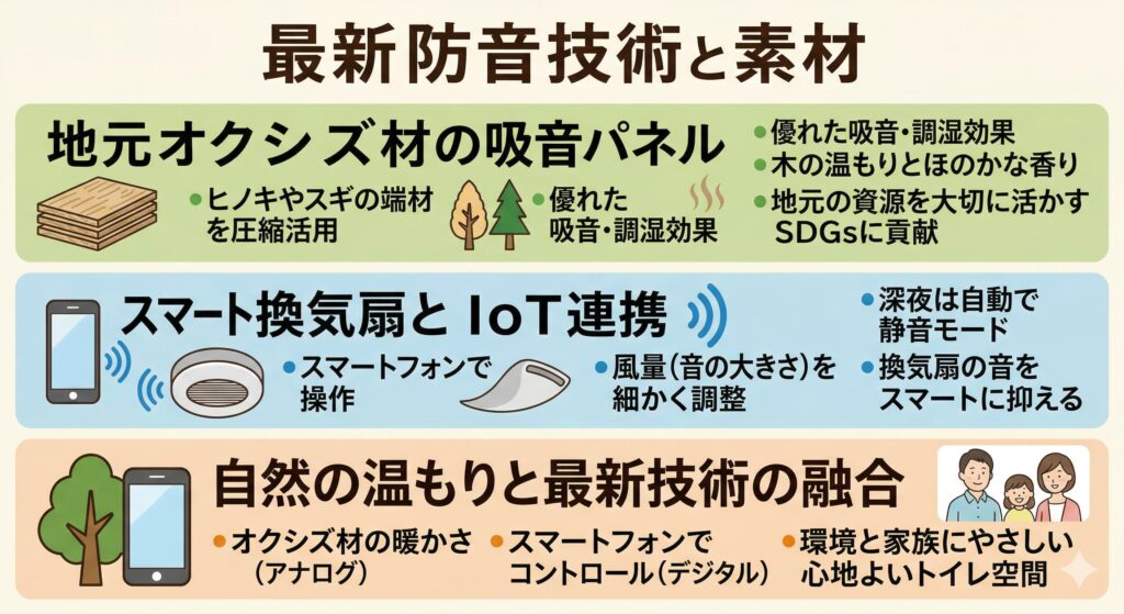 防音トイレリフォームの技術は、近年めざましく進化しています。音を抑えるだけでなく、環境への配慮やスマート機能との組み合わせなど、新しいアプローチが次々と登場しています。地元の木材を活かしたエコ素材から、スマートフォンで操作できる換気扇まで、静岡市ならではの視点も交えながら、最新の防音技術と素材をご紹介します。