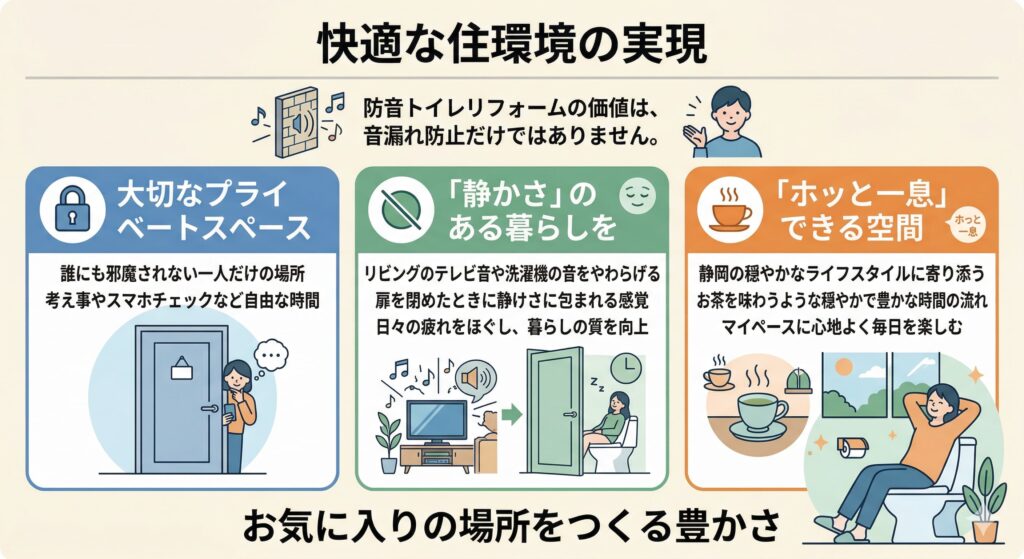 音を防ぐだけでなく、「家の中で一番ほっとできるお気に入りの場所」をつくること。それが、防音トイレリフォームが届けてくれる、暮らしの豊かさです。