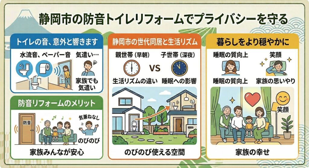 防音トイレリフォームは、そんな日常のさりげない気遣いを、住まいの構造からサポートしてくれます。二世帯・三世代同居のご家庭が多い静岡市ならではの視点も交えながら、プライバシーを守る防音トイレリフォームのメリットをご紹介します。