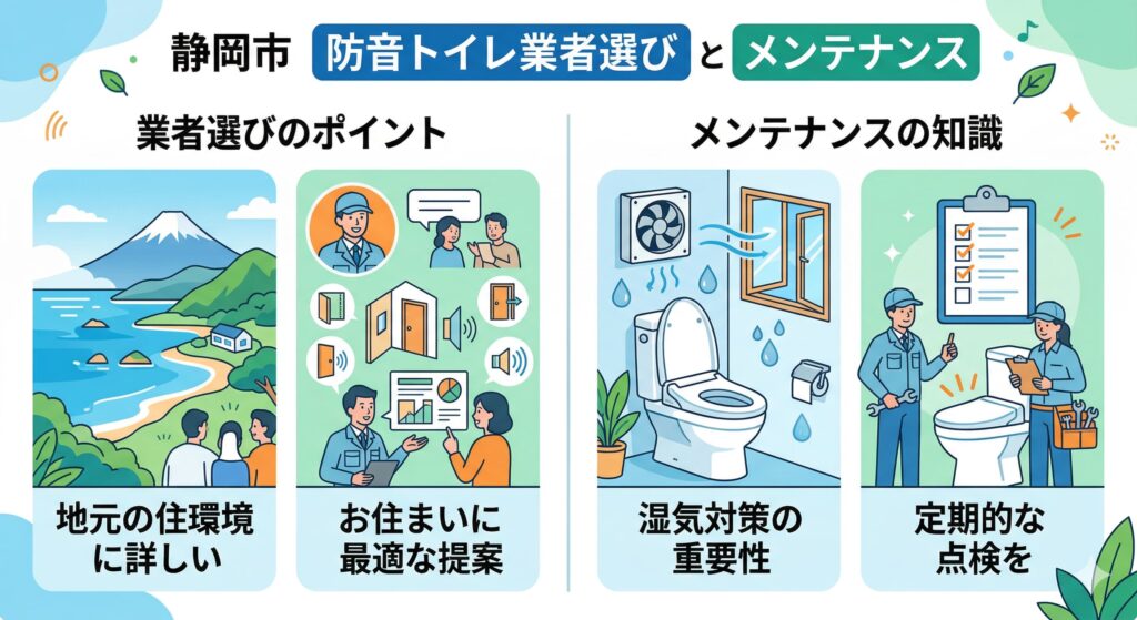 広大な市域を持つ静岡市では、海沿いの塩害対策が必要なエリアもあれば、山間部の冷え込みへの備えが大切なエリアもあります。静岡市の住環境をよく知っている業者は、お住まいの状況に合った防音トイレリフォームをお客様とご一緒に考えることができます。4章では、業者選びのポイントと、リフォーム後に役立つメンテナンスの知識をご紹介します。