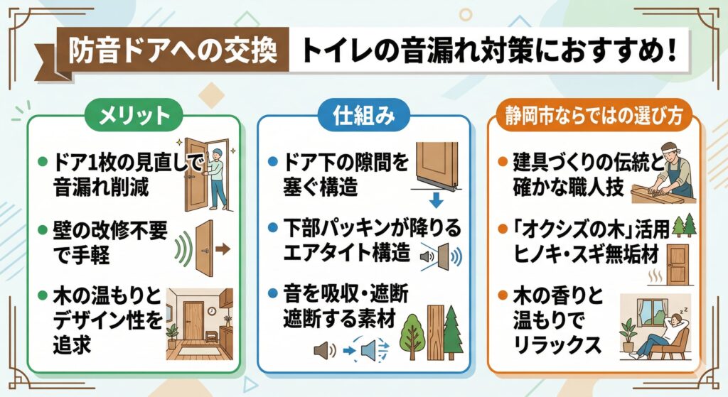 トイレの防音対策をはじめるなら、まず「ドアの交換」がおすすめです。壁を大きく改修しなくても、ドア一枚を見直すだけで音漏れを大幅に抑えることができます。さらに、建具づくりの伝統が息づく静岡市では、機能性だけでなく、インテリアとしての美しさや木の温もりにこだわったドア選びも楽しめます。防音ドアの仕組みと、静岡市ならではの選び方をご紹介します。