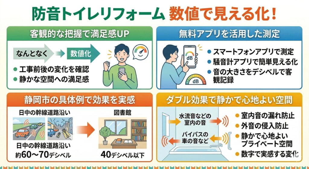 トイレの防音リフォームは、室内の水流音や生活音を外へ伝わりにくくするだけでなく、バイパスの車の音や近隣の生活音がトイレ内へ入ってきにくくなる効果もあります。ぜひリフォーム前後にスマートフォンで数値を測り、静かで心地よいプライベート空間への変化を数字で実感してみてください。