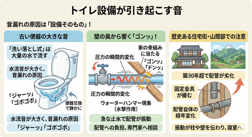 トイレの音漏れは、建物の構造だけでなく「トイレの設備そのもの」が原因となっているケースも多くあります。特に、築年数を重ねたお住まいでは、設備由来の音が気になりやすい傾向があります。