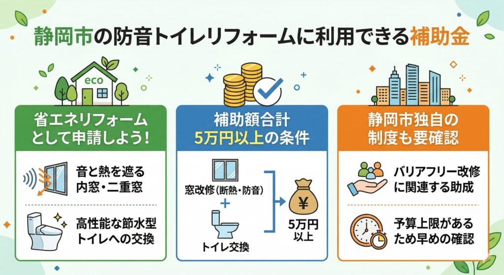 防音トイレリフォームを検討される際、費用面が気になる方も多いのではないでしょうか。実は、工事の内容によっては国や静岡市の補助金を活用できる可能性があります。申請の仕方をひと工夫するだけで、リフォーム費用をぐっと抑えられるケースもあります。ぜひ工事を始める前に、補助金の活用をご検討ください。