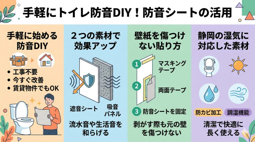 防音シートの効果を引き出すポイントは、役割の異なる2種類の素材を重ねて使うことです。まず音を外へ伝わりにくくする重みのある「遮音シート」を壁に貼り、その上から音を吸収するフェルトやスポンジ状の「吸音パネル」を重ねて貼ります。このひと手間を加えることで、トイレの流水音や生活音が隣の部屋へ伝わるのをぐっと和らげることができます。