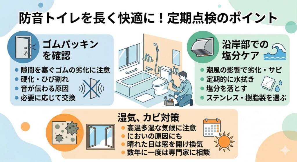 静岡市は高温多湿になりやすい気候のため、防音材の裏側や壁の内部に湿気がこもらないよう気を配ることが大切です。湿気が溜まると建材に影響が出たり、においの原因になったりすることがあります。晴れた日にはトイレの窓を開けてしっかり換気を行い、数年に一度は定期点検を活用することで、目に見えにくい部分も安心して保つことができます。