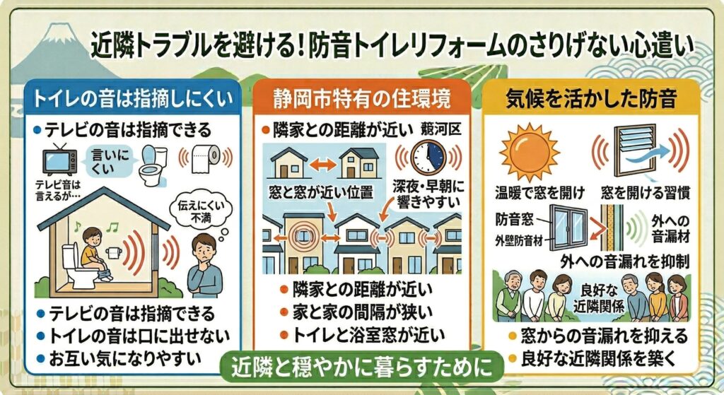 住まいの快適さは、家の中だけでなく、ご近所との穏やかな関係からも生まれます。実は、トイレの音はデリケートな性質ゆえに、お互いに伝えにくいまま気になってしまいやすいもの。トイレの音漏れに配慮することは、ご近所と長く良好な関係を育んでいくための、さりげない心遣いにもなります。静岡市の住環境や気候の特性も交えながら、近隣への音漏れ対策についてご紹介します。