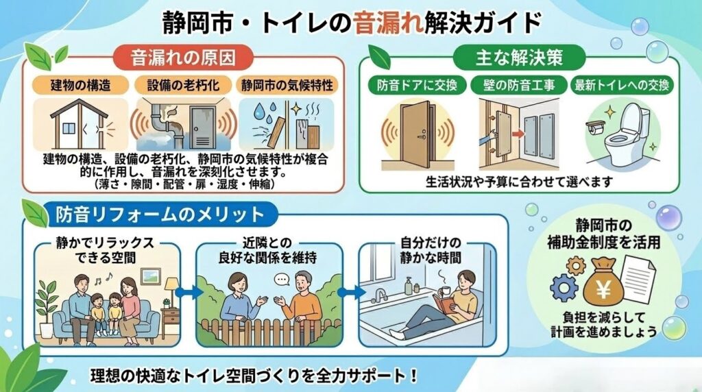 防音トイレリフォームは、音を抑えるだけでなく、家族みんながリラックスして使える空間をつくり、ご近所との穏やかな関係を守り、自分だけの静かな時間を生み出してくれます。静岡市の補助金制度を上手に活用することで、費用面でも無理なく計画を進めることができます。