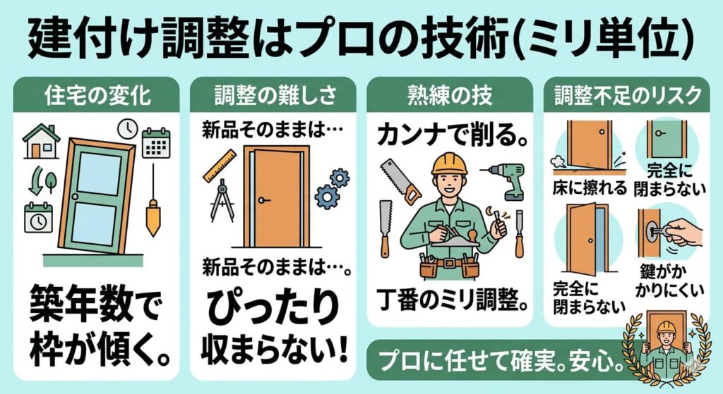 調整が不十分だと「床に擦れる」「完全に閉まらない」「鍵がかかりにくい」といった状態になることもあるため、建付け調整はプロに任せるのが確実で安心です。