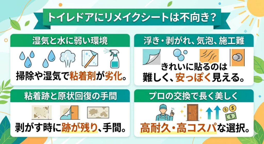 手軽に雰囲気を変えられるリメイクシートは人気のアイテムですが、トイレのドアには向かない場合があります。
