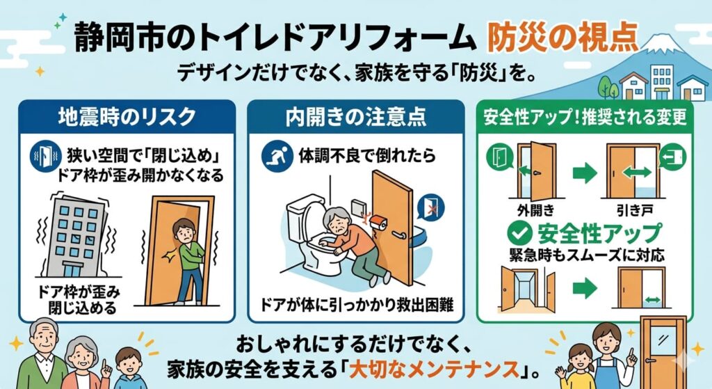 東海地震への備えが日常に根付いている静岡市では、住宅設備の見直しが安心な暮らしに直結します。トイレのドアリフォームにおいても、デザインだけでなく「防災」の視点を取り入れることが、家族を守る大切なポイントになります。