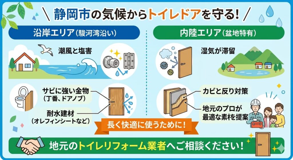 静岡市は、駿河湾に面した清水区・駿河区などの沿岸エリアから、湿気が滞留しやすい内陸の盆地まで、地域によって住環境が大きく異なります。全国向けのDIY情報では、こうした地域特有の気候への配慮が十分に反映されていない場合があるため、地元の事情を踏まえたドア選びが重要です。