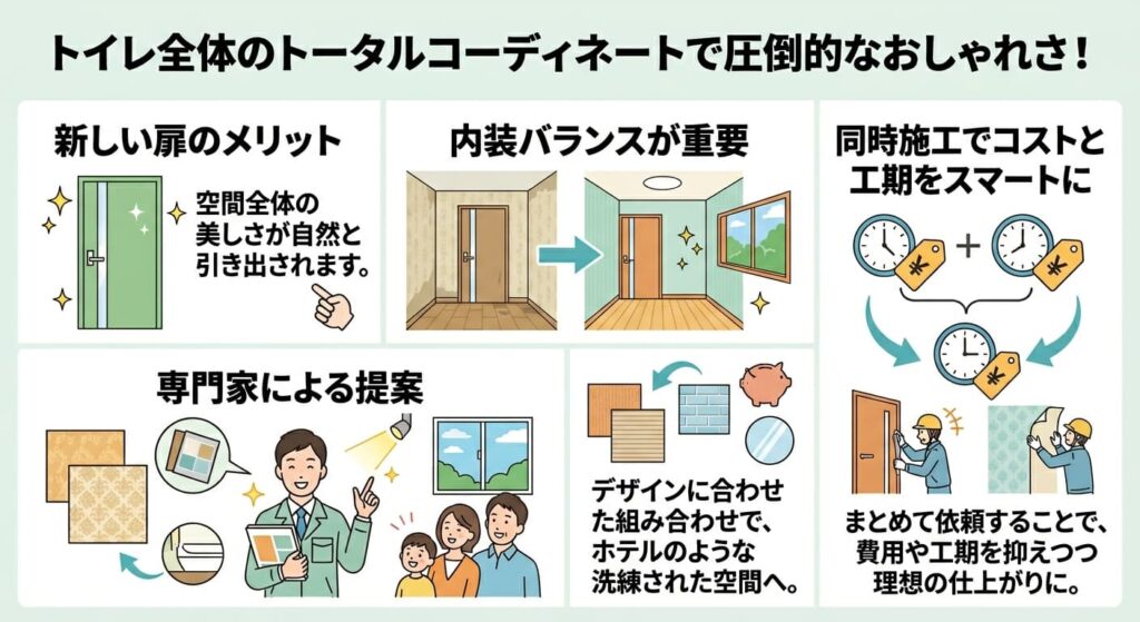 トイレのドアをリフォームする際、業者に依頼することで得られるメリットは、施工の確実さだけではありません。内装全体とのトータルコーディネートや、補助金制度の活用サポートなど、専門家だからこそ実現できる価値があります。