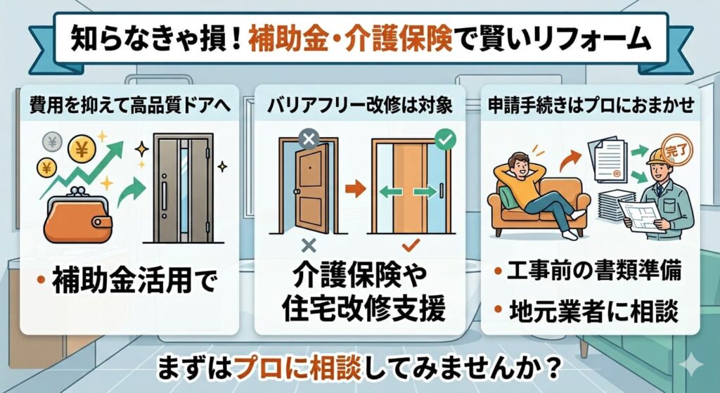 「トイレリフォーム業者に依頼すると費用が高くなりそう」とお考えの方にぜひ知っていただきたいのが、補助金制度の活用です。要件を満たすことで、費用を抑えながら高品質なドアへの交換が実現できます。