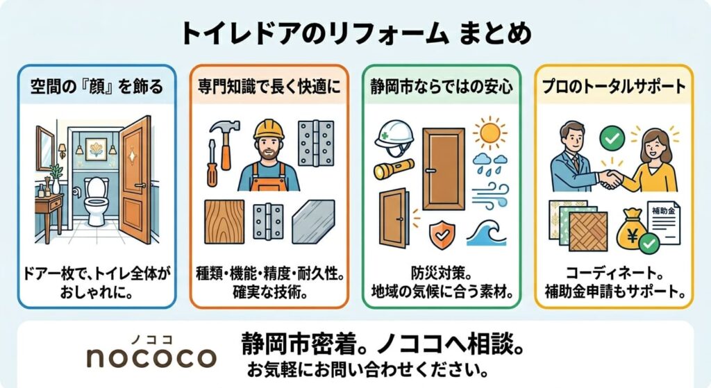 トイレのドア交換は、空間をおしゃれにするだけでなく、いざというときに家族の安全を支える「住まいの大切なメンテナンス」でもあります。静岡市にお住まいの方にはぜひ、防災の視点もあわせてドア選びをご検討いただければ幸いです。