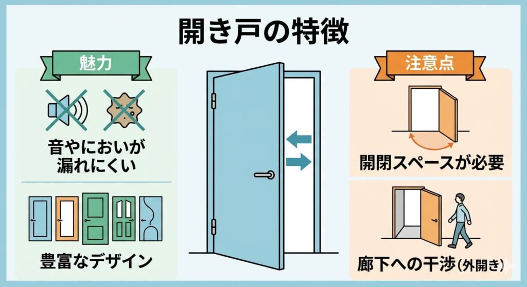 たとえば廊下幅が限られている場合、外開きドアは生活動線と干渉することがあるため、開閉方向の検討が重要です。