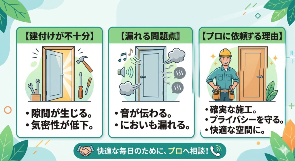 せっかくデザインにこだわったドアに交換しても、プライバシーをしっかり守れてこそ本当の満足感が得られます。音やにおいへの配慮も含めた確実な施工のために、プロへの依頼がおすすめです。
