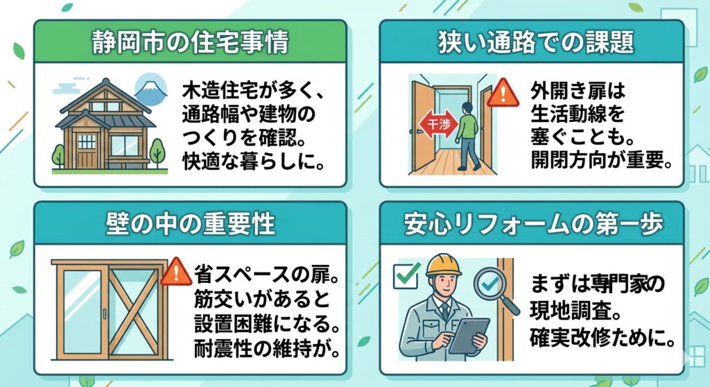 東海地震への備えが身近な静岡市では、緊急時にドアが開けやすい構造かどうかが、家族の安全に関わる重要な要素になります。