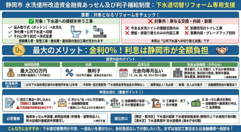 静岡市には「水洗便所改造資金融資あっせん及び利子補給制度」という支援制度があります。