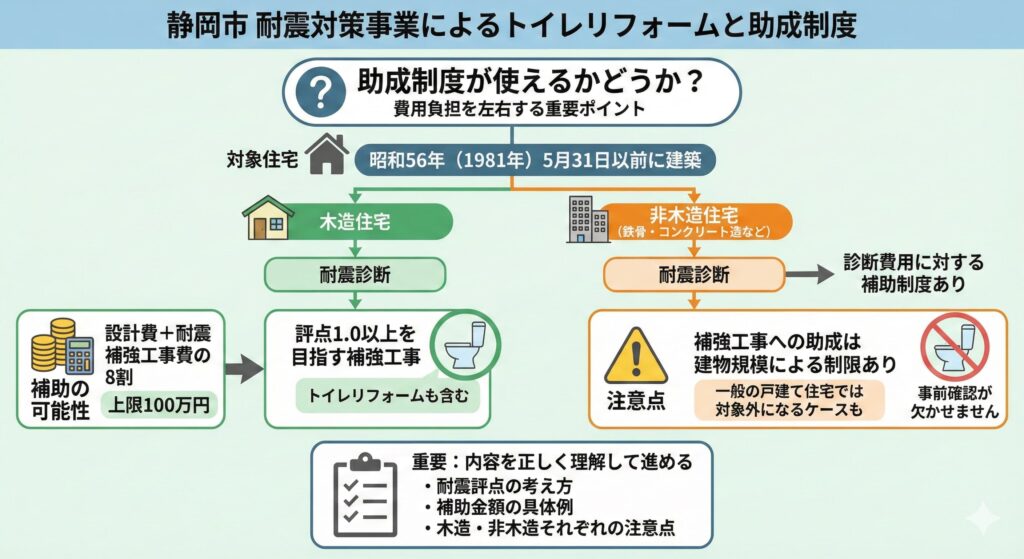 👉 防災トイレリフォームと静岡市の耐震関連補助金については、対象条件や金額の考え方を詳しく解説した以下の記事で確認できます。