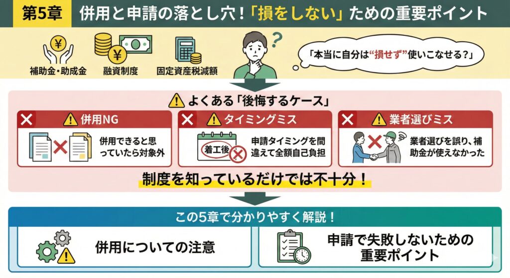 補助金は正しく使えば大きな節約になります。しかし、ルールを知らないと1円も受け取れません。