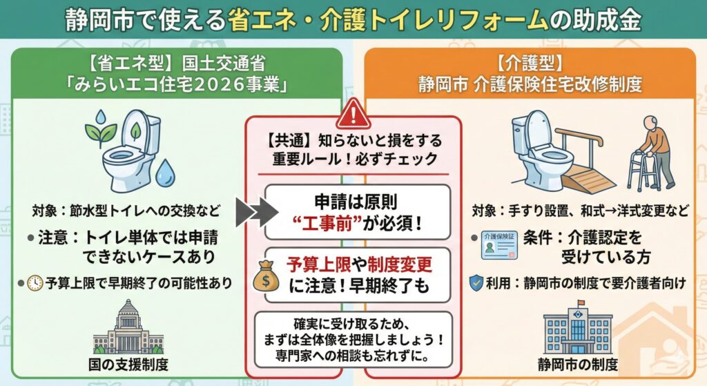 静岡市でトイレリフォームを検討するなら、国の省エネ支援制度である国土交通省関連の「みらいエコ住宅2026事業」と、介護認定を受けている方が利用できる静岡市の介護保険住宅改修制度は、必ずチェックしておきたい制度です。