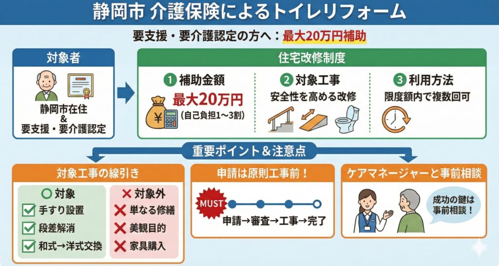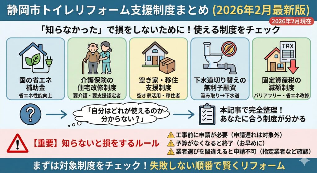 この章では、静岡市ならではの支援制度をトイレリフォームとどう絡めて活用できるのかという視点で、わかりやすく整理していきます。