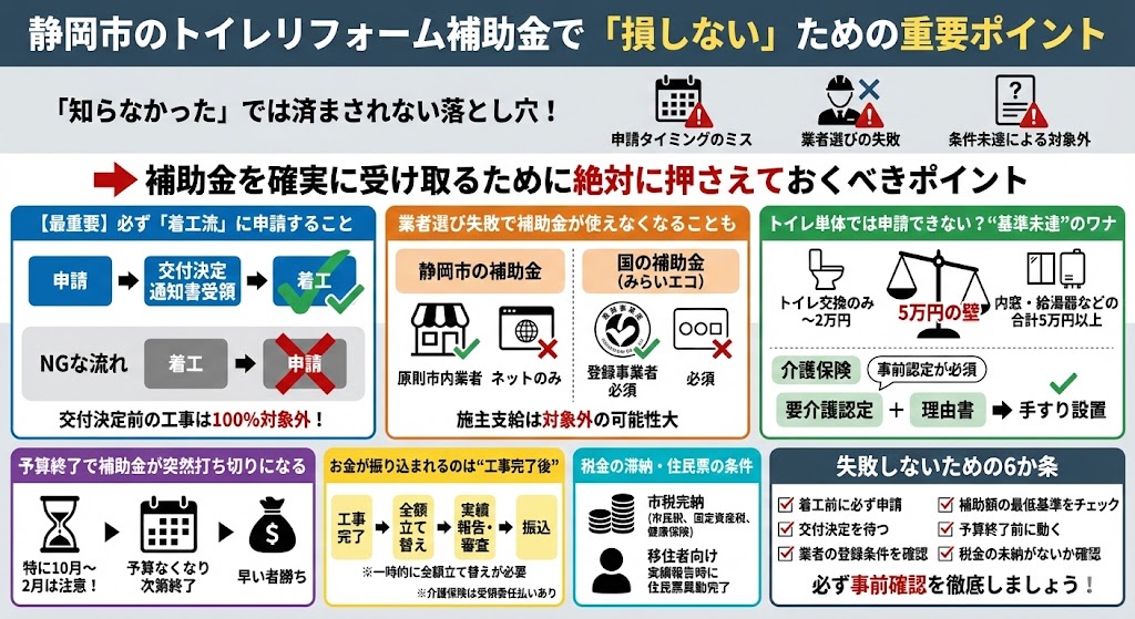 静岡市でトイレリフォームの補助金を活用するなら、「知らなかった」では済まされない落とし穴があります。
