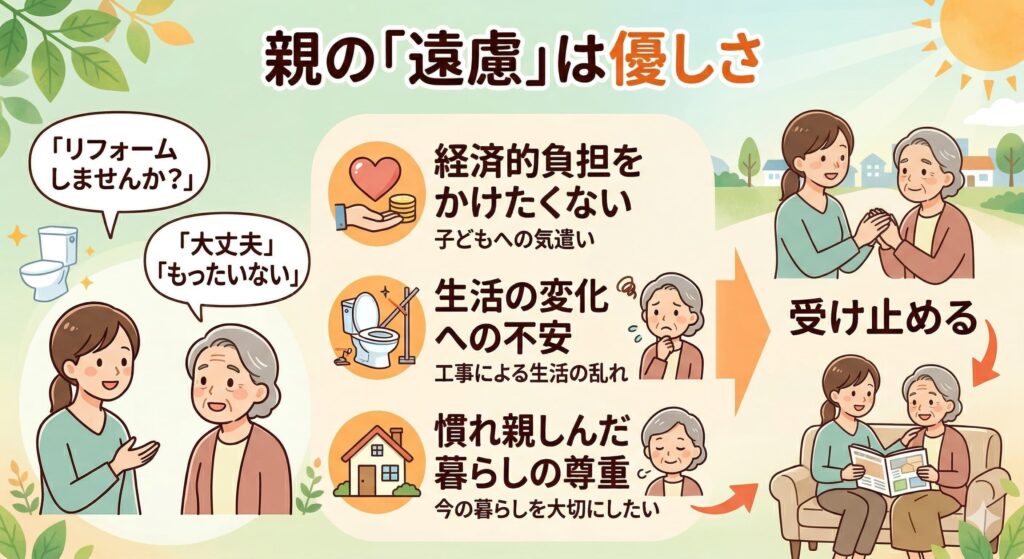 「トイレをきれいにしてあげたい」という子どもとしての純粋な気持ちが、思わぬ「遠慮の言葉」に返ってきて、戸惑った経験はありませんか。ご両親の「もったいない」には、実は家族への深い愛情が込められています。その本音を知ることが、リフォームへの第一歩になります。