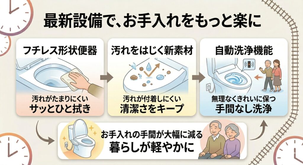 「トイレ掃除が少し大変になってきた」という声は、実家でよく聞かれるようになる言葉のひとつです。最新の設備は、そんな日々のひと手間をぐっと減らして、いつも清潔で気持ちのよい空間をキープするお手伝いをしてくれます。
