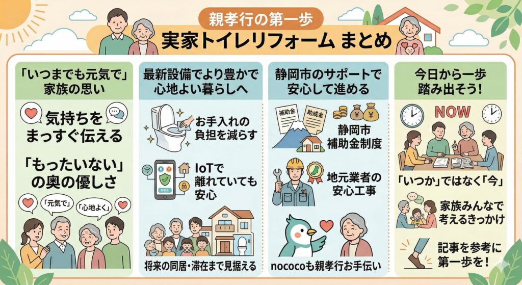 「いつか」ではなく「今」を、家族で一緒に考えるきっかけにして、この記事を参考に、実家のトイレリフォームの第一歩を踏み出してくださると幸いです。