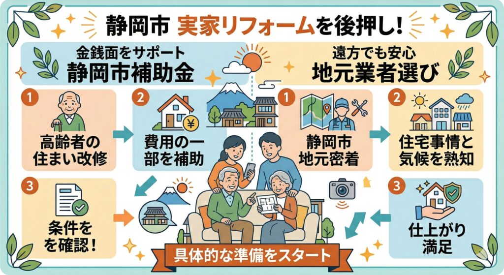 また、遠方から実家の工事をお願いする場合は、静岡市の住宅事情や気候をよく知る地元密着の業者に依頼することが、仕上がりの満足度と安心感につながります。