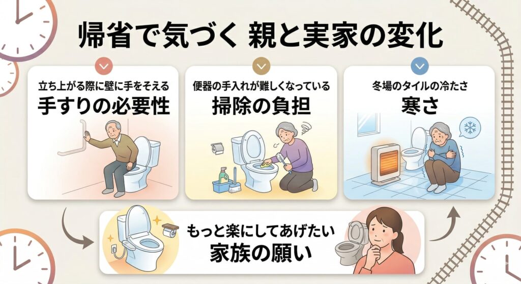 普段離れて暮らしているからこそ、たまの帰省ではご両親の変化や、実家の設備の移り変わりがより鮮やかに目に映るものです。