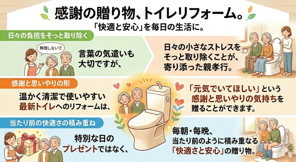 特別な日のプレゼントではなく、毎朝・毎晩、当たり前のように積み重なっていく「快適さと安心」としての贈り物が、トイレリフォームにはあります。