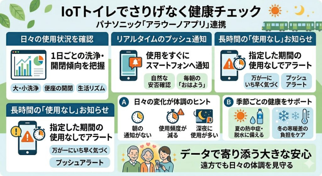 「いつもは朝一番に使うのに、今日はお昼を過ぎても通知がない」「夜中に何度か起きているようだ」といった日々のちょっとした変化が、体調やからだのサインをいち早くキャッチするヒントになることがあります。