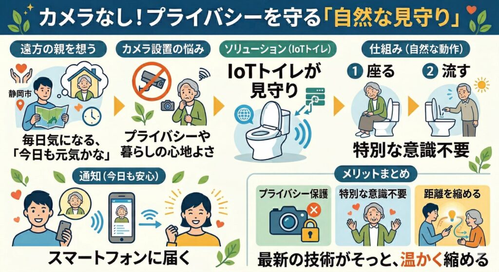 遠方から静岡市で暮らすご両親のことを思うとき、「今日も元気にしているかな」と気になるのは、ごく自然な気持ちです。かといって、リビングに見守りカメラを設置することには、ご両親のプライバシーや、日々の暮らしの心地よさへの配慮も必要です。