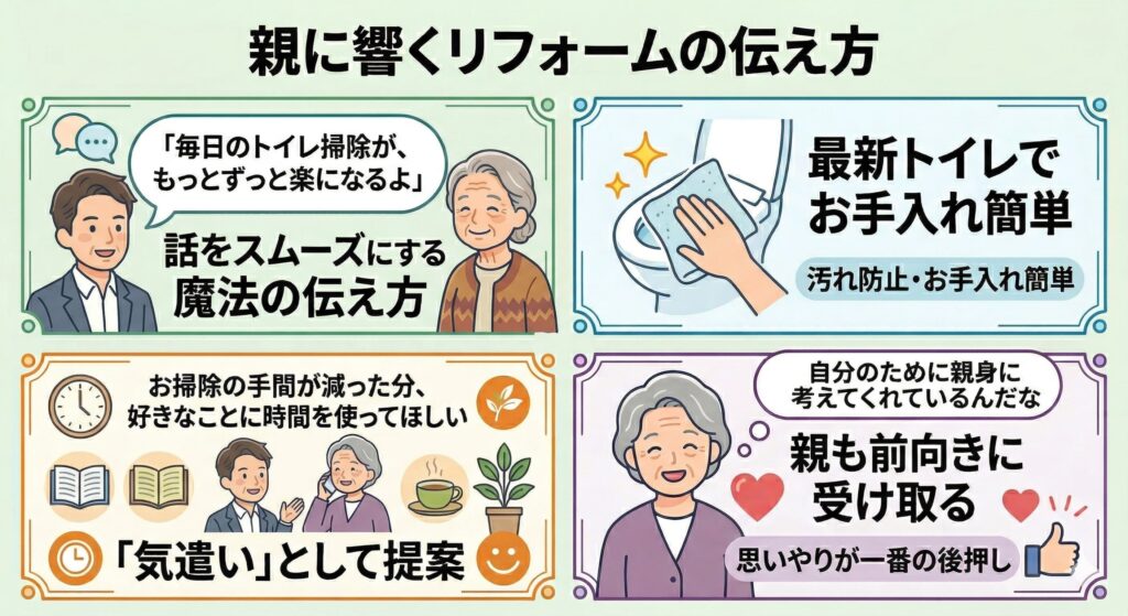 設備の性能や費用の話は、もう少し後回しにしても大丈夫です。ご両親が心から嬉しいのは、新しいトイレそのものよりも、「子どもが自分の健康をこんなに大切に考えてくれている」という気持ちが伝わる瞬間ではないでしょうか。