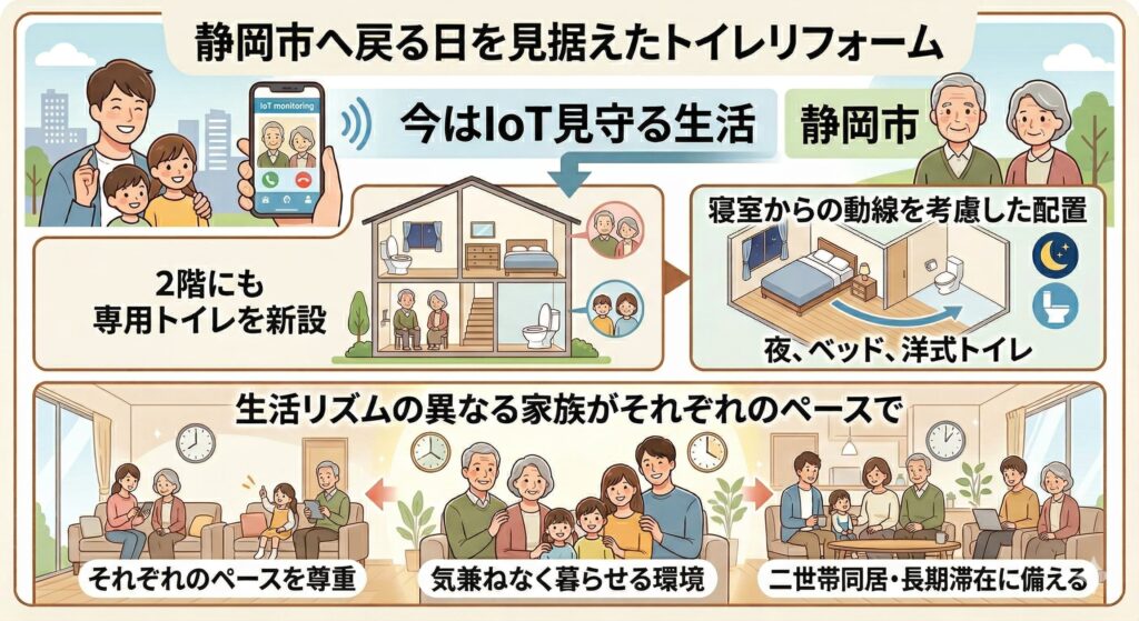 いまは離れて暮らし、IoT機能を活用した見守りが中心の生活であっても、将来はご両親のそばで過ごす時間を増やしたい、と考えているご家族も多いのではないでしょうか。静岡市へのUターンや、実家への長期滞在を選ぶ日が来たとき、今回の実家トイレリフォームがその暮らしをしっかり下支えしてくれます。