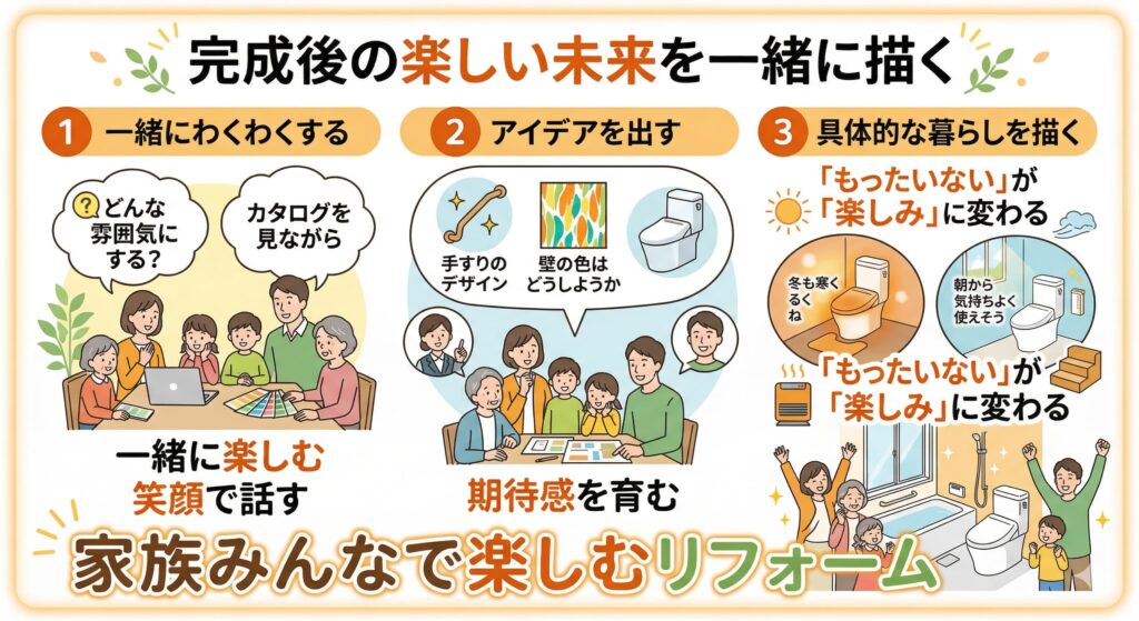 「どんな雰囲気のトイレにしようか」「手すりはどんなデザインが好み?」「壁の色はどうしようか」という会話をご両親と一緒に楽しみながら進めることで、リフォームへの期待感が自然と育まれていきます。